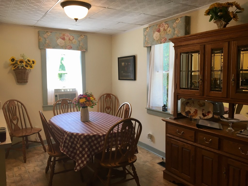 Upon entry, you see the kitchen, painstakingly renovated to be warm, and inviting for all the cooks in the family. We stock the kitchen with pots, pans, dishware, utensils, silverware, bowls, measuring spoons, & small appliances. The kitchen also has some basic staples such as flour, sugar, oil, vinegar, rice, salt, pepper tea and coffee. Ask about our concierge grocery service!